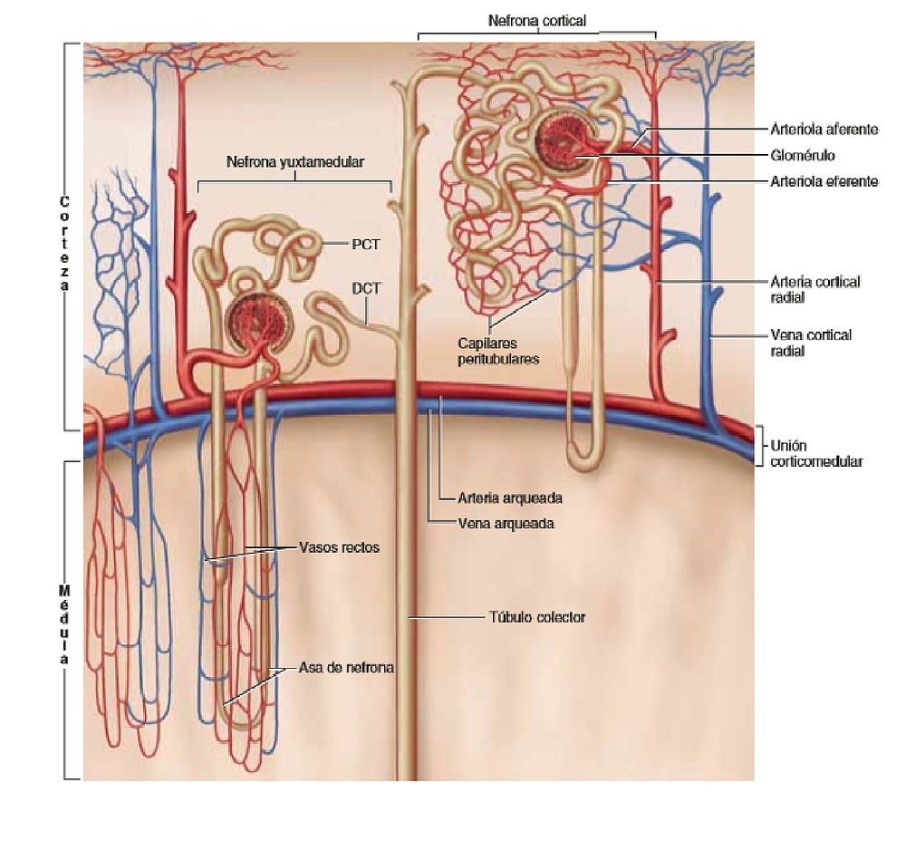 - Las arteriolas eferentes de los glomérulos corticales dan origen a una red capilar peritubular que rodea a los túbulos uriníferos locales.