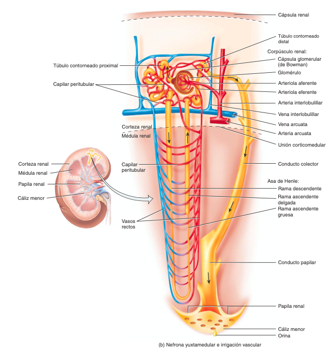 - Las arteriolas eferentes de los glomérulos yuxtamedulares descienden hacia el interior de la médula a lo largo del asa de Henle.