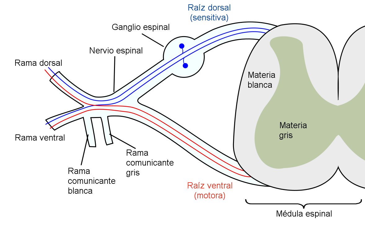 La raíz posterior presenta un voluminoso ensanchamiento: el ganglio espinal, situado aproximadamente a un centímetro de la médula espinal.