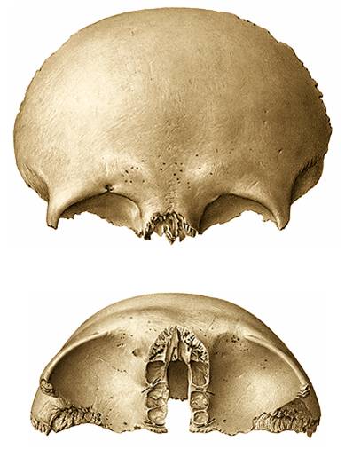 - En la escama o porción vertical, a ambos lados de la línea mediana, se distinguen dos amplias depresiones: las fosas frontales.