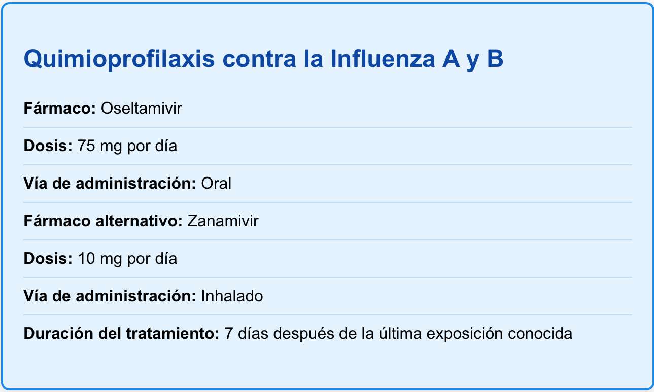 También se recomienda considerar la quimioprofilaxis en personas para quienes la vacunación está formalmente contraindicada —por ejemplo, debido a reacciones alérgicas graves a componentes de la vacuna— y que, al mismo tiempo, presentan un riesgo elevado de desarrollar complicaciones severas si se infectan. Del mismo modo, en el contexto de brotes institucionales, como los que ocurren en residencias de adultos mayores o unidades hospitalarias cerradas, la administración profiláctica de antivirales a todos los residentes, incluso si han sido vacunados, puede ser necesaria, especialmente si la cepa del brote no coincide con las cepas contenidas en la vacuna estacional. En estos casos, la duración del tratamiento debe extenderse por un mínimo de dos semanas y continuar hasta al menos una semana después de la aparición del último caso clínico.
