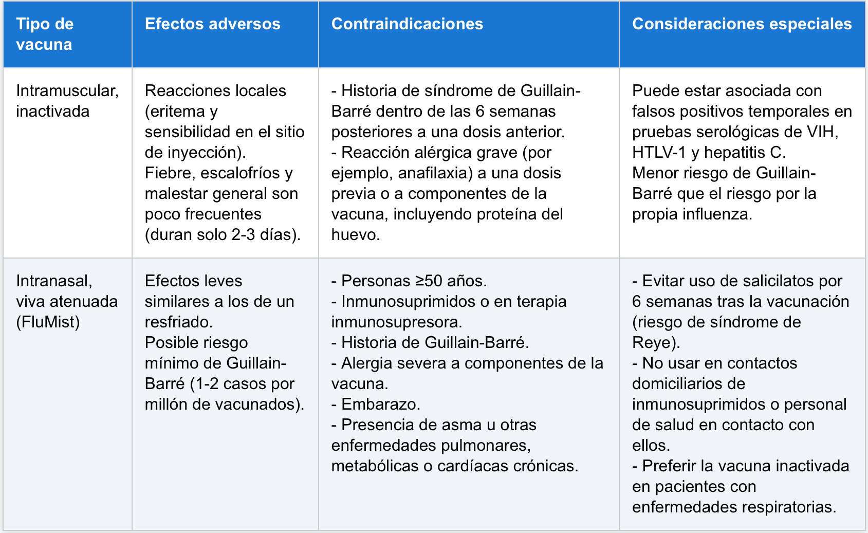 En términos de seguridad y compatibilidad inmunológica, las vacunas contra la influenza pueden administrarse conjuntamente con otras inmunizaciones, como las vacunas contra la enfermedad por coronavirus tipo 2, sin evidencia de interferencia inmunitaria ni incremento significativo en los eventos adversos. Esta práctica facilita la implementación de campañas de vacunación simultáneas, optimizando recursos y ampliando la cobertura poblacional.