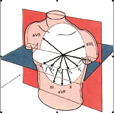 Las tres derivaciones estándar de las extremidades y las tres derivaciones aumentadas están alineadas en el plano frontal del tórax. Las seis derivaciones precordiales se alinean en el plano horizontal del tórax.