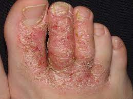 - En la planta de los pies y el talón puede manifestarse como una descamación no inflamatoria crónica, en ocasiones con engrosamiento y agrietamiento.